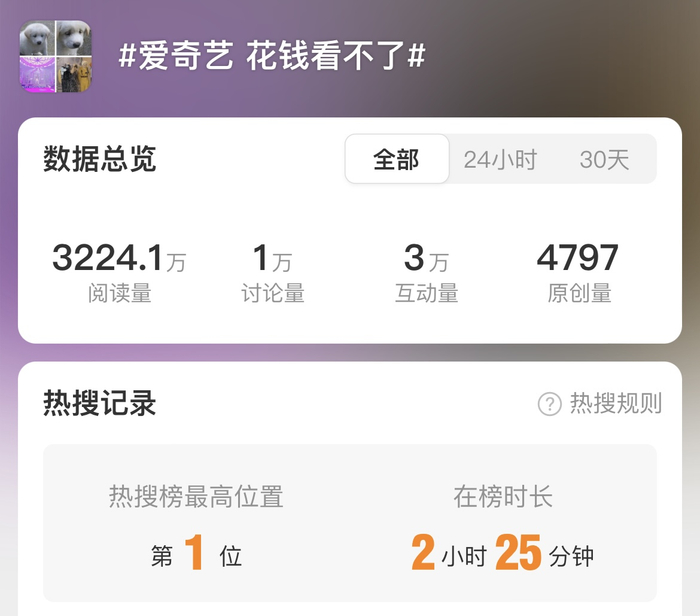 但在开赛后不久,“爱奇艺 花钱看不了”话题迅速冲上微博热搜榜第一。