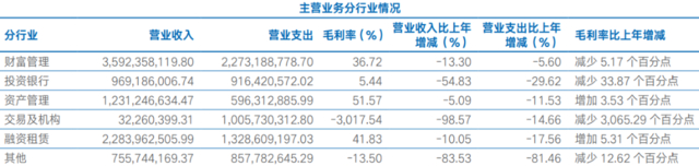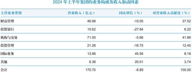从国泰君安的收入分类看,对营收贡献度最大的是机构与交易业务,占比高达42%,其次是财富管理,占比达28%。两者的业务体量都超过45亿元,在业内举足轻重。