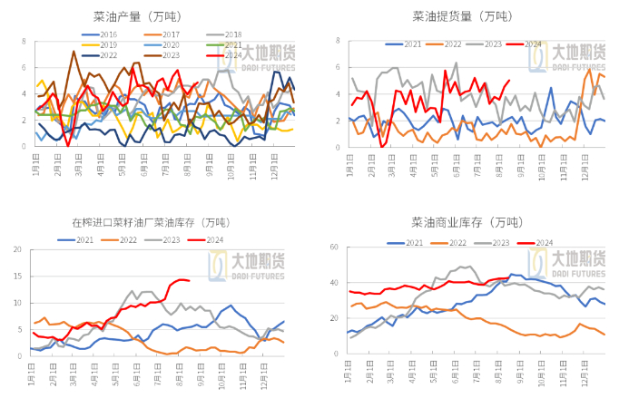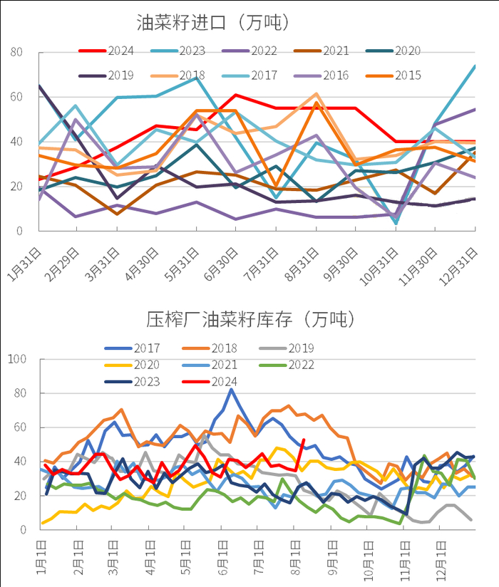 2024年加拿大供应继续充足,国内进口利润丰厚,1-6月进口加拿大菜籽226万吨,进口依然庞大,导致国内菜籽供应宽松,库存较高。
