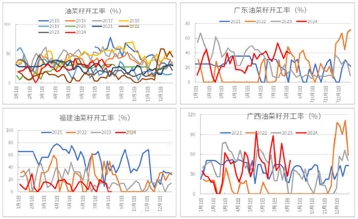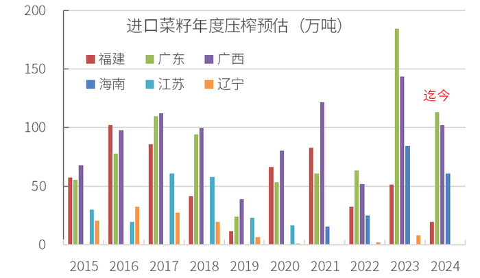 进口菜籽压榨厂集中在广东、广西、福建、江苏和辽宁。2021年后,海南新增1家进口菜籽压榨厂,2021年压榨量约15万吨,2023年增加至84万吨,今年迄今压榨约61万吨,压榨量不断增加。2021年开始,江苏和辽宁基本不再压榨进口菜籽。