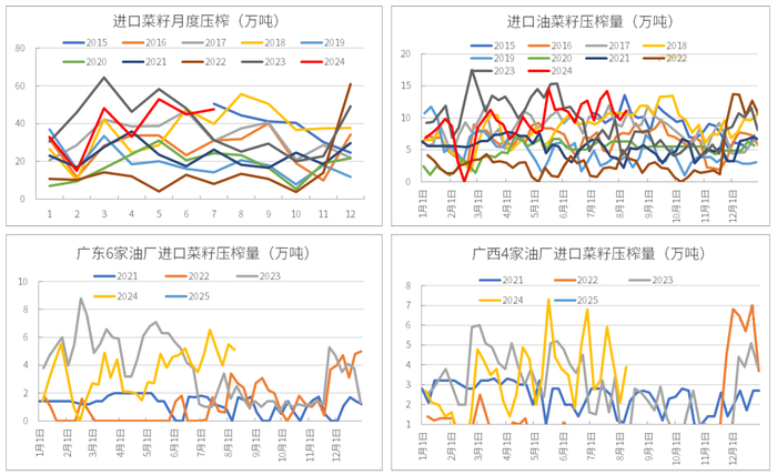进口菜籽压榨主要集中在两广和海南地区。