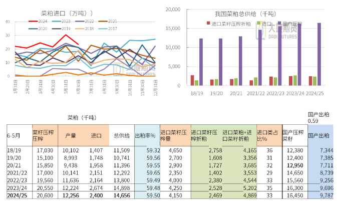 23/24年度进口菜粕267万吨,预估24/25年度进口240万吨,占菜粕总供给的17%左右。进口菜籽压榨折粕大约250万吨左右,占比也约有17%。综合看,进口菜粕+进口菜籽压榨折粕共占国内共计总量的30%-35%左右。