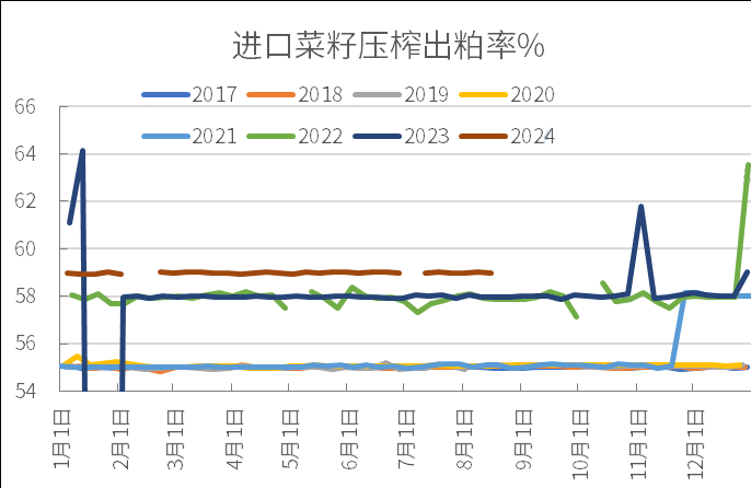 进口菜籽压榨出粕率:今年周度出粕率大多在59%,2023年出粕率在58%左右。16-21年的出粕率在55%左右。