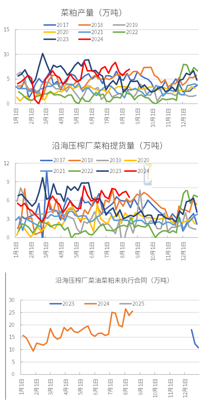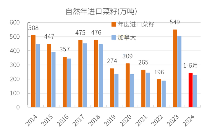 作为对比,2023自然年我国进口菜籽549万吨(折油约236万吨,折菜粕约318万吨),进口菜粕237万吨,进口菜油235万吨。