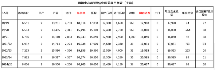 23/24年度进口菜油220.6万吨,占总供给量的23%。预估24/25年度生产菜油758.3万吨,进口200万吨,年度结余30万吨。