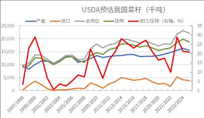 我国菜籽压榨产能丰富,以国产和进口菜籽为原料,按USDA数据预估,近几年进口菜籽占国内菜籽压榨量的份额大多在20%~25%之间。