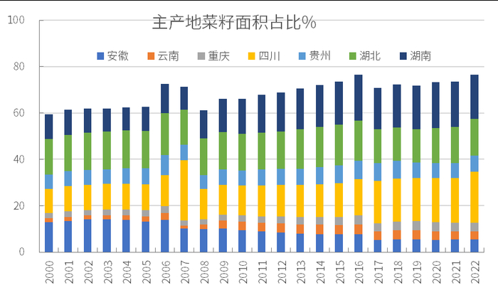 我国菜籽主要是冬油菜,10-12月播种,来年4-5月收获上市。主要分布在长江流域:云贵川、重庆、两湖和安徽等,这7个省的面积占全国的70%以上。其中两湖面积占比约有35%,四川近些年的占比提升至20%左右。