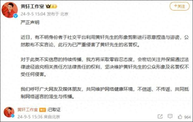 @黄轩工作室 9月5日发布声明称,近日,有不明身份者于社交平台利用黄轩先生的形象剪影进行恶意捏造与诽谤,公然散布不实言论,此行为已严重侵害了黄轩先生的名誉权。
