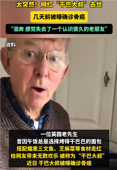 9月4日下午,某平台百万粉丝网红博主发布视频称,吃“干巴面包”走红的网红大叔已去世。8月底,大叔被确诊患上骨癌,从确诊到离世,只有短短一周时间。