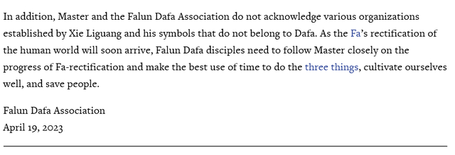 该网站还贴出了“法轮功”所属“明慧网”2023年4月19日驱逐信徒谢利光的部分英文公告。