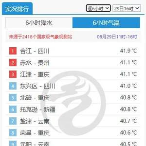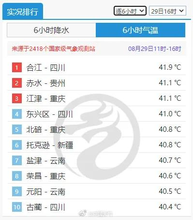 中国天气网发文称,川渝地区高温酷热天气持续,或持续到9月上旬,具有一定的极端性。截至8月29日16时,四川东部、重庆一带的部分地区气温高达40°C以上。