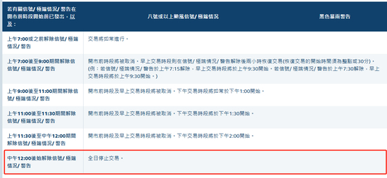 不过在今年9月23日之后,港交所在恶劣天气下不休市,维持运作。投资者在新安排下,可以在香港发出八号或以上台风信号,以至黑色暴雨警告期间,照常买卖香港股票和衍生产品。同时,沪深港股通也正常交易。