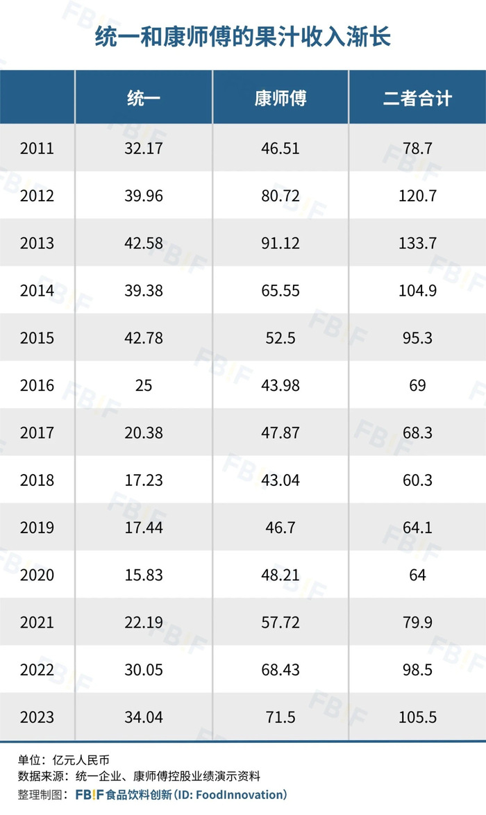2023年统一的果汁营收34.042亿元,同比增长13.3%,创7年历史新高,相比于2017年翻了一番[5]。而康师傅来自果汁类饮品的收入达到了71.5亿元[6],二者之和终于重回三位数水平。
