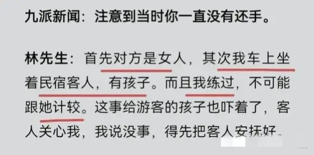 事后在接受九派新闻记者的采访时,林先生也表示,当时车上坐着他民宿的客人,对方还带着孩子。