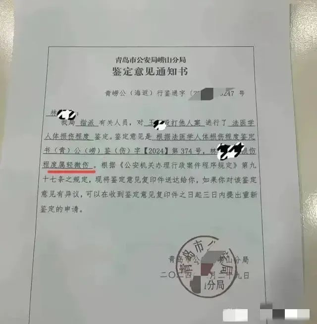 事件发生之后,青岛警方很快就对被打者的伤情进行了权威的“法医学人体损害程度鉴定”,结果为轻微伤!