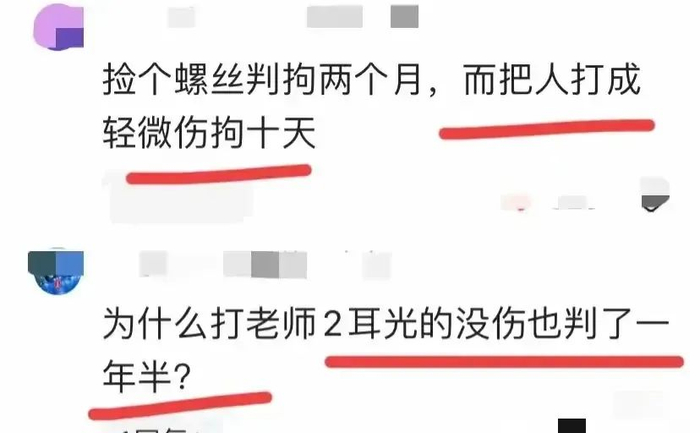 更是有网友质疑称,“为什么打老师两耳光的没伤也判了一年半?”