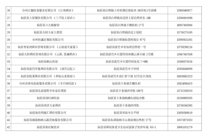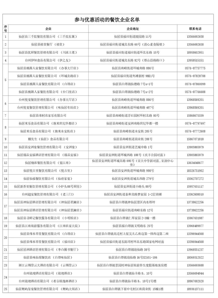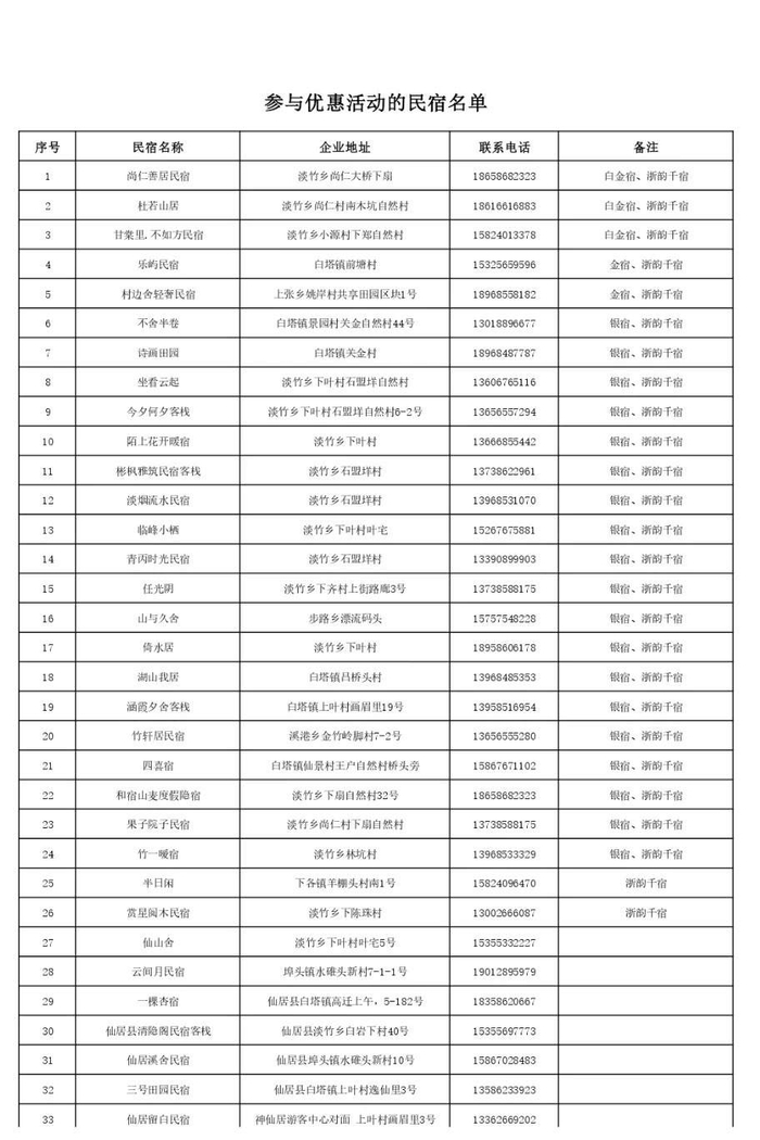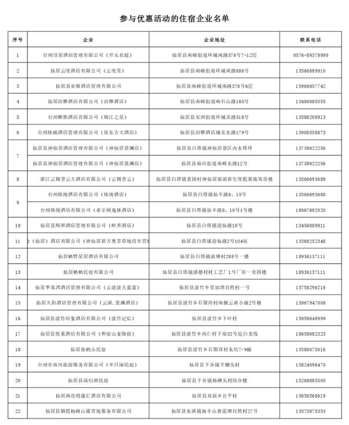 活动期间,仙居的55家酒店、民宿,42家餐饮都可凭杭温高铁车票(终点站为仙居站)享受优惠折扣。详情如下: