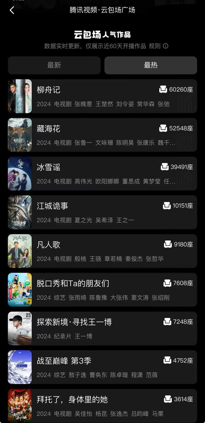 不仅如此,腾讯视频还推出了“云包场广场”与“云包场榜单”。相当于一个基于全新逻辑的、打乱剧综影这些原有频道分类的曝光窗口,有助于让内容进行广场式扩圈传播。