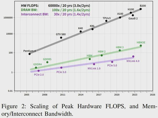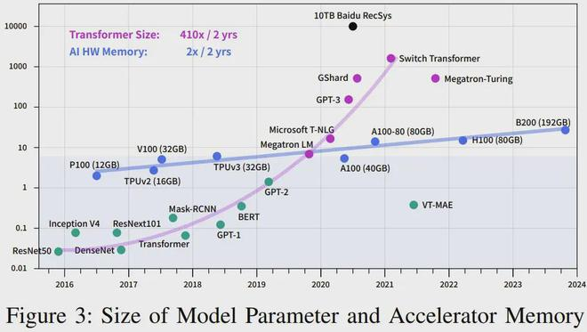 可以看到,AI 对算力的需求每年都以 10 倍幅度增长,而硬件速度每两年增长 3 倍、DRAM 带宽增长 1.6 倍、互连带宽则仅有 1.4 倍。