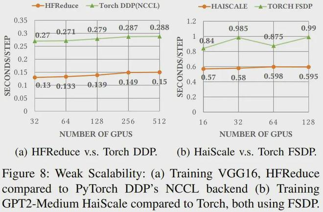 如图 8a 所示,相较于使用 Torch DDP 的 NCCL 后端,使用 HFReduce 训练 VGG16 模型所需的时间仅为前者的一半,当 GPU 数量从 32 增至 512 时可实现近 88% 的并行可扩展性。
