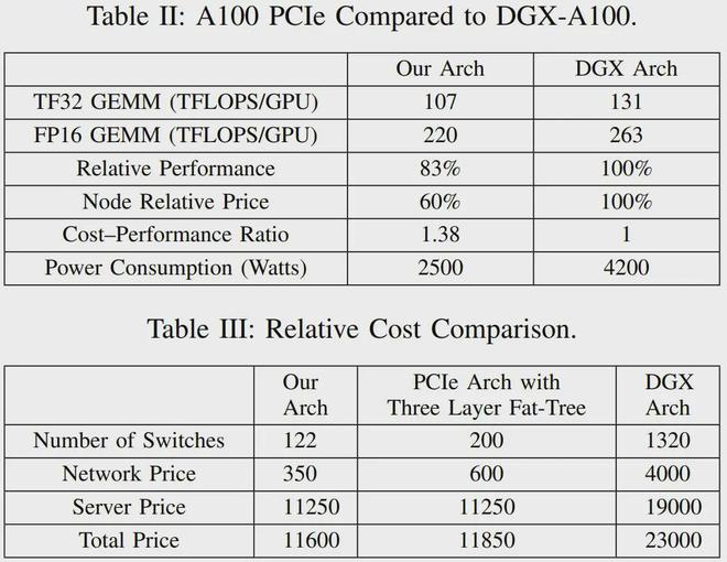 在 TF32 和 FP16 GEMM 基准上,相比于英伟达 DGX-A100 架构,DeepSeek 设计的这套架构的计算性能为前者的 83%。但是,其成本和能耗的下降幅度要大得多,仅为前者的 60%,如表 2 所示。