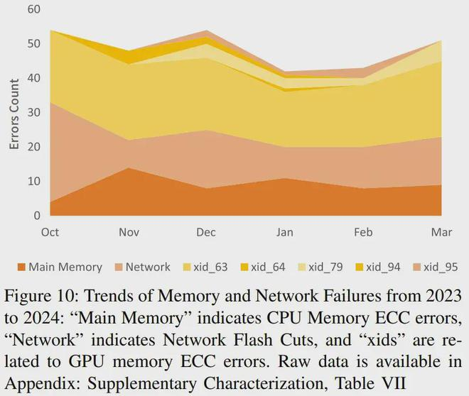 最后,他们验证了这整套设计的稳定性和稳健性。下图总结了他们在 2023-2024 年遇到的内存和网络故障趋势。