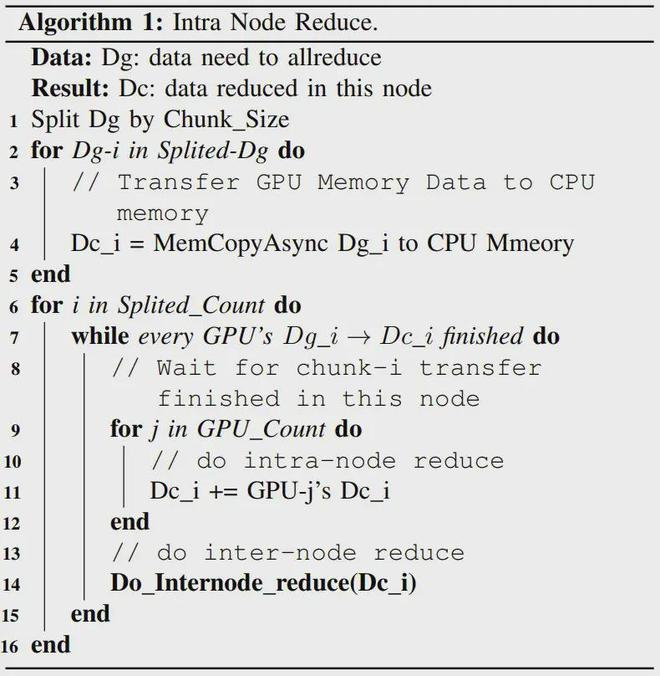 有了高效的硬件,也自然需要适配的软件。该团队开发了一个用于高效 allreduce 运算的软件库:HFReduce。HFReduce 的核心策略见图 6,其包括节点内(算法 1)和节点间(算法 2)的 reduce。