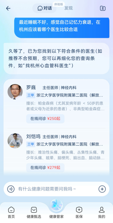 针对患者最刚需的找医生和挂号服务,“AI健康管家”可根据病症描述从超90万医生中做精准推荐,并直接对接在线问诊和挂号服务。张俊杰表示,录入系统的90万医生中,70%来自三甲医院,但“精准匹配”的目标,并不是帮患者找最“顶”的医生,而是找最“对症”的医生。