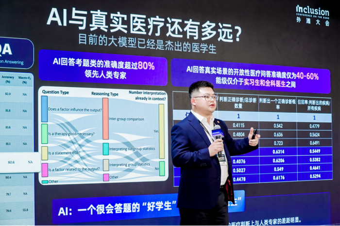 真实临床病例的诊断能力一直是AI的“软肋”,用潘家骅的话说,AI是个好学生,但不是个好医生。AI过往学习到的以文献(课本、指南、论著)为主,ChatGPT等人工智能应用虽然能在裸考的情况下通过美国医师考试,但回答真实场景医疗问题的准确率仅为40%-60%,能级介于实习生和全科医生之间。