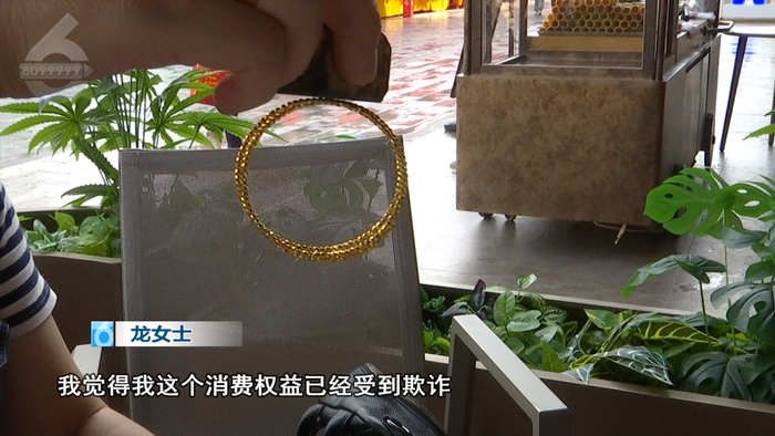 龙女士说她买的这款手镯是一口价黄金首饰,商家称原价17000元但可以打5折。于是龙女士用自己同品牌的金戒指抵扣5000元、又补了3800元的差价换购了手镯。