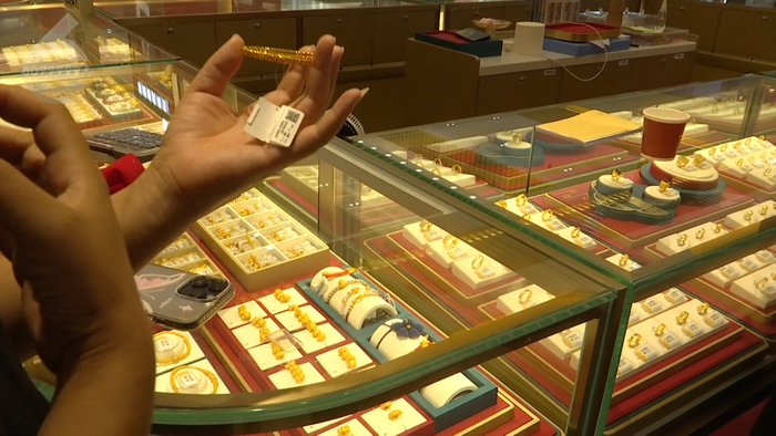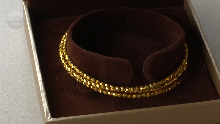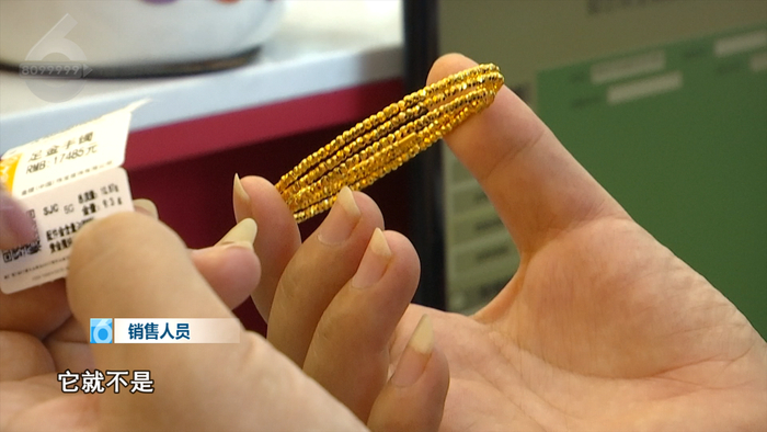 随后,记者跟随龙女士来到这家店铺。销售人员表示,这款手镯他们一直都在售卖,该手镯是由黄金珠子串联而成,而里面的“穿绳”确实是钢丝,所以会被磁铁吸住,但金珠部分确实是足金。