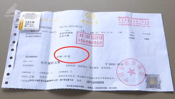 销售人员:“10.68克到10.87克,这个上面写了总重量10.87克,0.01克的空气浮动是正常的,补了3700元左右。”
