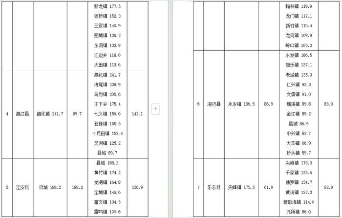 预计,6日20时~7日20时各地雨量:海口、澄迈、临高、儋州、白沙和昌江等市县250~350毫米、局地450毫米以上,文昌、定安、琼海、屯昌、琼中、五指山、保亭、乐东、东方和三亚等市县150~250毫米,万宁和陵水等市县80~150毫米。