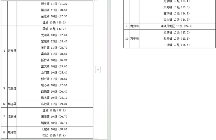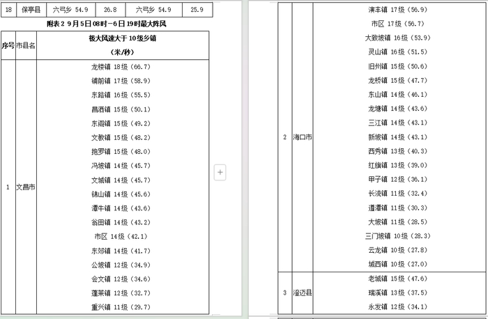 十级风圈(约120公里):已影响海口、文昌、澄迈、临高、儋州、琼海、定安、屯昌、白沙,预计至6日21时还将覆盖到昌江、东方,7日01时离开海口,7日08时完全离开海南岛;