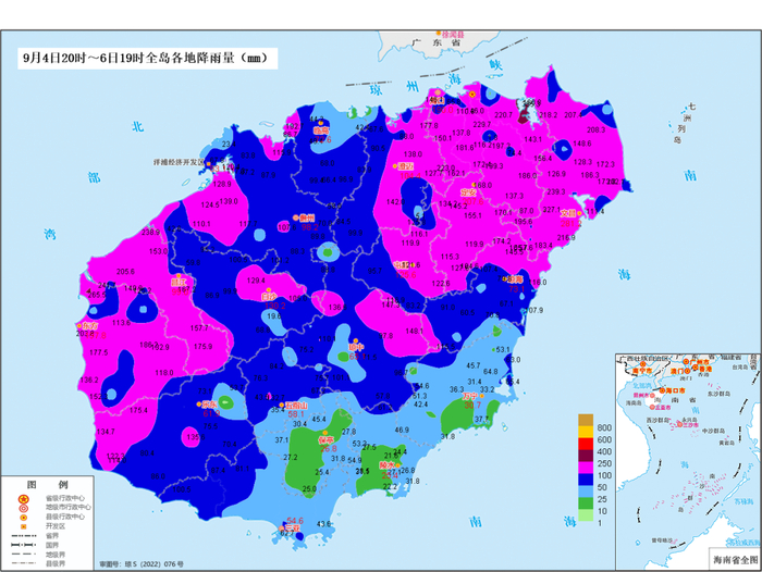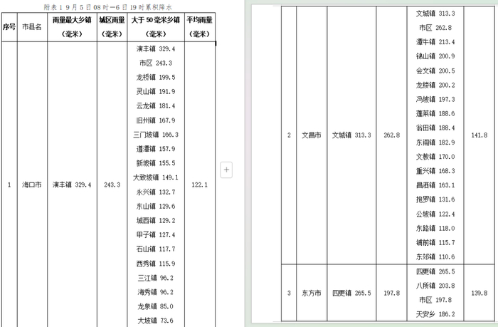 5日08时-6日20时,海南岛大部分地区有暴雨到大暴雨,局地有特大暴雨,最大为海口市演丰镇329.4毫米;文昌、澄迈、海口、定安、屯昌、昌江、临高、琼海、儋州和万宁10个市县共70个乡镇(区)出现10级以上阵风,最大为文昌市龙楼镇17级以上(66.7米/秒)。