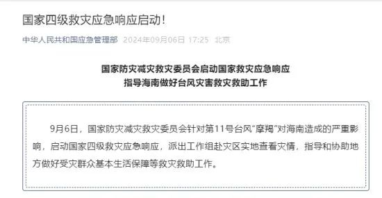 9月6日,国家防灾减灾救灾委员会针对第11号台风“摩羯”对海南造成的严重影响,启动国家四级救灾应急响应,派出工作组赴灾区实地查看灾情,指导和协助地方做好受灾群众基本生活保障等救灾救助工作。