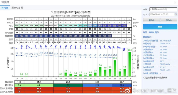 海南文昌铜鼓岭出现了66.7米/秒