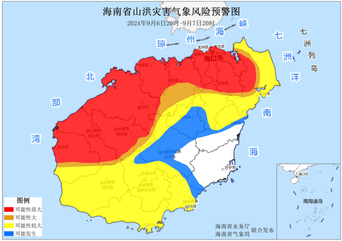 海南省水务厅、海南省气象局9月6日18时联合发布红色山洪灾害气象风险预警:预计,9月6日20时至9月7日20时,文昌市(蓬莱镇)、东方市(感城镇)、五指山市(毛阳镇、番阳镇)、澄迈县(加乐镇、文儒镇)、定安县(新竹镇、雷鸣镇、富文镇)等市县的部分地区发生山洪灾害气象风险的可能性达到橙色预警级别,其中,海口市(长流镇、西秀镇、海秀镇、石山镇、东山镇、永兴镇、龙桥镇、新坡镇、遵谭镇、龙泉镇、龙塘镇、云龙镇、红旗镇、三门坡镇、大坡镇、甲子镇、旧州镇、灵山镇、演丰镇、大致坡镇)、儋州市(和庆镇、南丰镇、大成镇、雅星镇、兰洋镇、光村镇、木棠镇、海头镇、峨蔓镇、三都镇、王五镇、白马井镇、中和镇、排浦镇、东成镇、新州镇)、文昌市(东路镇、潭牛镇、东阁镇、抱罗镇、冯坡镇、锦山镇、铺前镇、公坡镇)、东方市(东河镇、大田镇、三家镇、四更镇、新龙镇、天安乡、江边乡)、澄迈县(老城镇、瑞溪镇、永发镇、中兴镇、仁兴镇、福山镇、桥头镇、大丰镇)、临高县(加来镇、东英镇、波莲镇、博厚镇、皇桐镇、多文镇、和舍镇、南宝镇、新盈镇、调楼镇)、乐东黎族自治县(万冲镇)、琼中黎族苗族自治县(黎母山镇)、定安县(定城镇、龙湖镇)、白沙黎族自治县(牙叉镇、七坊镇、邦溪镇、打安镇、细水乡、元门乡、南开乡、阜龙乡、青松乡、金波乡、荣邦乡)、昌江黎族自治县(叉河镇、十月田镇、乌烈镇、昌化镇、海尾镇、七叉镇、王下乡)的部分地区发生山洪灾害气象风险的可能性达到红色预警级别。
