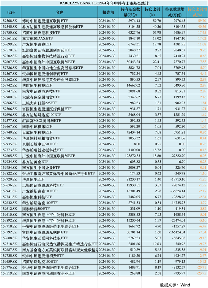 今年上半年,巴克莱银行新进持仓有博时中证港股通互联网ETF、易方达恒生港股通高股息低波动ETF、招商中证香港科技ETF等。