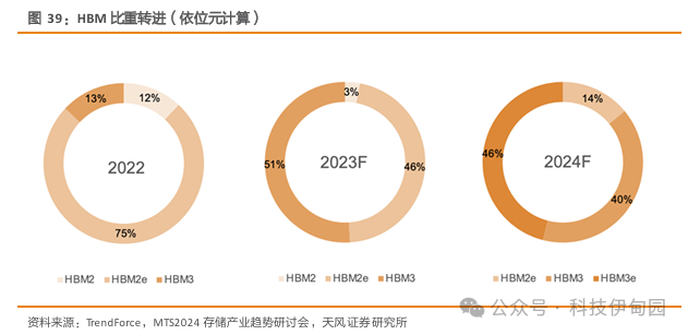 HBM迭代进程:2024年HBM2、HBM2e 和3e的市场份额会发生比较明显的改变。 2023上半年主流还是 HBM2e,但是因为 H100 的问世,下半年 HBM3 就成为市场主流,很快2024 年就会进行到 HBM3e,因为它堆叠的层数更高,所以平均单价一定要比现在再高20%-30%以上,所以它对产值的贡献会更明显。