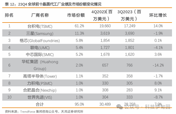 TrendForce集邦咨询研究显示,2023年第四季全球前十大晶圆代工业者营收季增7.9%,达304.9亿美元,环比增长7.9%,回暖迹象明显。主要受惠于智能手机零部件拉货动能延续,包含中低端Smartphone AP与周边PMIC,以及Apple新机出货旺季,带动A17主芯片、周边IC如OLED DDI、CIS、PMIC等零部件。其中,台积电(TSMC)3nm高价制程贡献营收比重大幅提升,推升台积电第四季全球市占率突破六成。