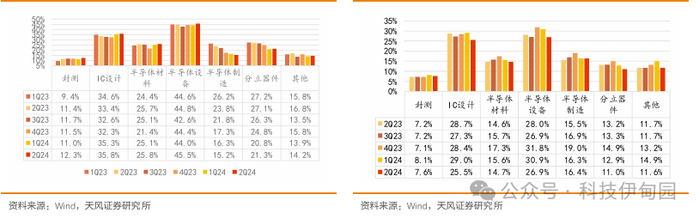 二季度半导体行业库存回到健康水位,IC设计板块受到下游为新品备货的影响,二季度营收480.3亿元,环比增长20.4%,营收增长显著。我们预计竞争格局较好的领域(例如存储)产品有望率先涨价,进而带动毛利率的提升。费用率方面,二季度IC设计板块环比有所下降,细分来看,研发费用率为17%,环比下降约3pct,管理费用率二季度为5%环比基本持平,销售费用率为3%,环比略降。需求端,我们看好AI带来的创新应用对IC设计板块的需求拉动,关注AI手机/AI PC/智能眼镜/智能戒指等新品的市场反馈。
