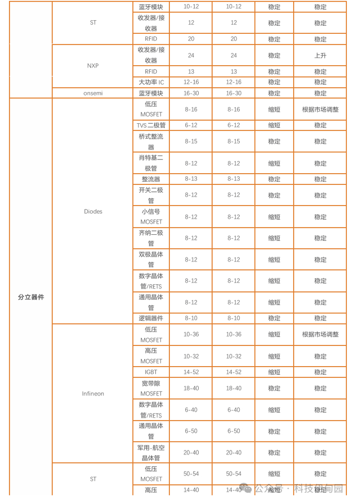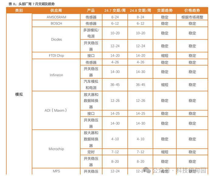 整体芯片交期趋势: 7月,主要芯片类别货期短期趋稳,但需要关注部分产品波动风险。