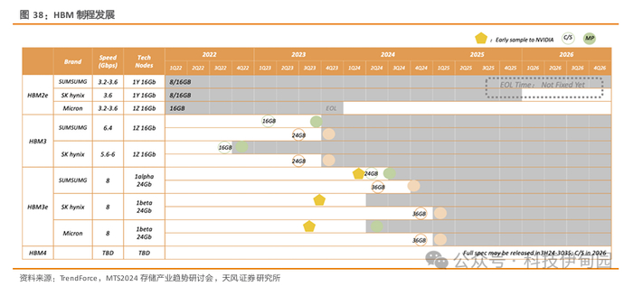 HBM 的制程发展:目前市场上最新HBM3E,即第5代HBM,正搭载在英伟达的产品中。随着AI相关需求的增加,第六代高带宽存储器HBM4最早将于2026年开始量产。据韩媒报道,SK海力士已开始招聘 CPU 和 GPU 等逻辑半导体设计人员。SK海力士希望HBM4堆栈直接放置在GPU上,从而将存储器和逻辑半导体集成在同一芯片上。这不仅会改变逻辑和存储设备通常互连的方式,还会改变它们的制造方式。如果 SK海力士成功,这可能会在很大程度上改变部分半导体代工的运作方式。