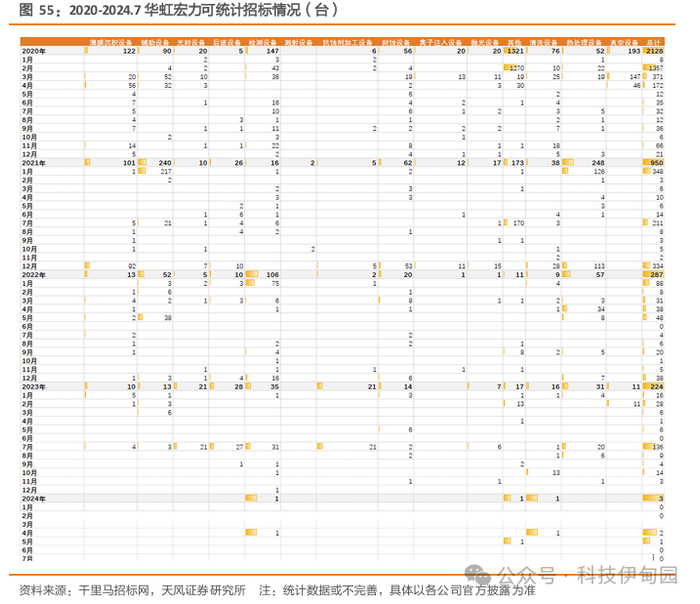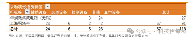 2020-2024年 7月,华虹宏力可统计招标设备共3592台,包括246台薄膜沉积设备、395台辅助设备、56台光刻设备、69 台后道设备、305台检测设备、2 台溅射设备、34台抗蚀剂加工设备、152台刻蚀设备、33台离子注入设备、45台抛光设备、1523台其他设备、140 台清洗设备、388台热处理设备、204台真空设备。