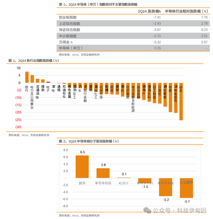 2024 年二季度,申万半导体行业指数上涨 0.35%,同期创业板指数下跌 7.41%,上证综指下跌2.43%,深证综指下跌5.87%,中小板指下跌2.15%,万得全A指数下跌5.32%,半导体在23年一季度跑赢主要指数。细分板块里,封测在二季度有较强的表现。