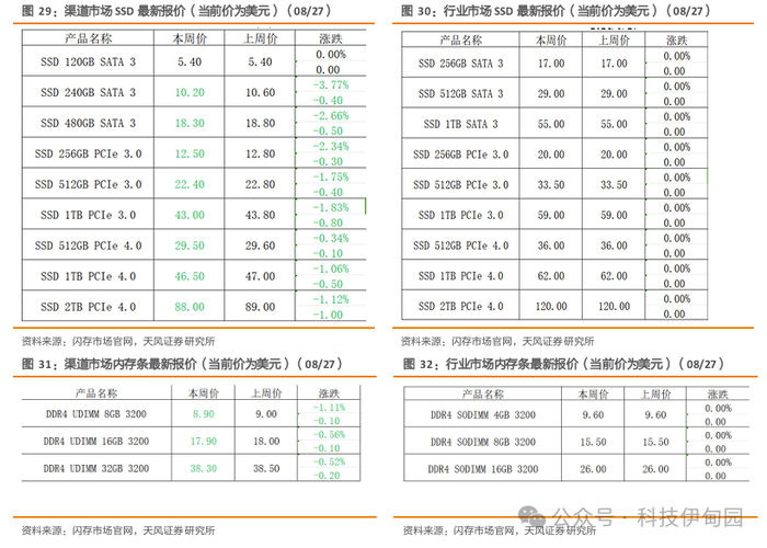 根据闪存市场公众号对存储行情的周度(截至 2024.08.27)评述,本周上游资源方面,近期NAND Flash Wafer价格和部分DDR颗粒价格小幅下调。渠道市场方面,跌幅明显缩窄;渠道厂商持续深陷倒挂漩涡,小容量基本不再降价出售,近期需求相对有所好转,但市场消沉的态势并未真正扭转,本周渠道内存条和SSD价格小幅下跌。行业市场方面,PC 需求端普遍已建立较高的库存水位,部分头部PC品牌上半年库存增幅较大,整体还在积极消耗库存当中。整体来看本周行业 SSD和内存条价格维持稳定。近期,存储市场不确定性进一步加剧,继原厂上半年取得不俗的盈利之后,下半年原厂愈发重视市场份额的变化,在不确定性更强的消费类市场积极促成特殊订单,适当灵活调整市场策略。