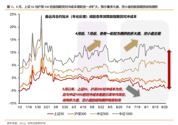 理论上说,期货贴水-股息率即为持有对应指数现货的对冲成本。而大盘指数对冲成本为负,中小盘指数对冲成本为正的结构,则说明股指期货市场参与者集中于多大盘、空小盘的交易,且这一分化在8月达到高位(图2)。