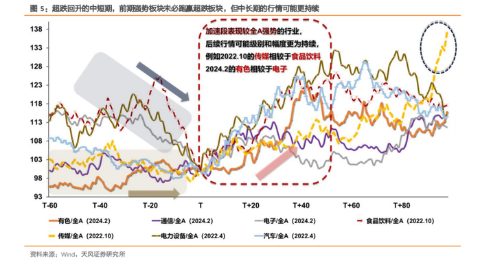 但即使是前期强势的板块,在市场见底前一周左右的时间内,通常会有跑输全A的阶段,代表市场出清完成前强势板块的“补跌”(例如22年10月的传媒,24年1-2月的通信)。这些板块在下跌段抗跌,可能有更强的逻辑,后续回升段的演绎短期或跑输超跌板块,但中期更强势(图5)。
