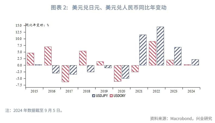 不同的是,无论从基本面内生增长动能、日央行加息计划,还是日元套息交易规模来看,日元升值的确定性要强于人民币。而人民币升值的动力主要归因于外因——美联储降息带动中美利差倒挂收敛、境内美元流动性宽松;日元套息交易平仓波及人民币;前期积累的未结汇盘将在预期扭转后修复人民币升值弹性。但内因对人民币升值的支撑力偏弱。